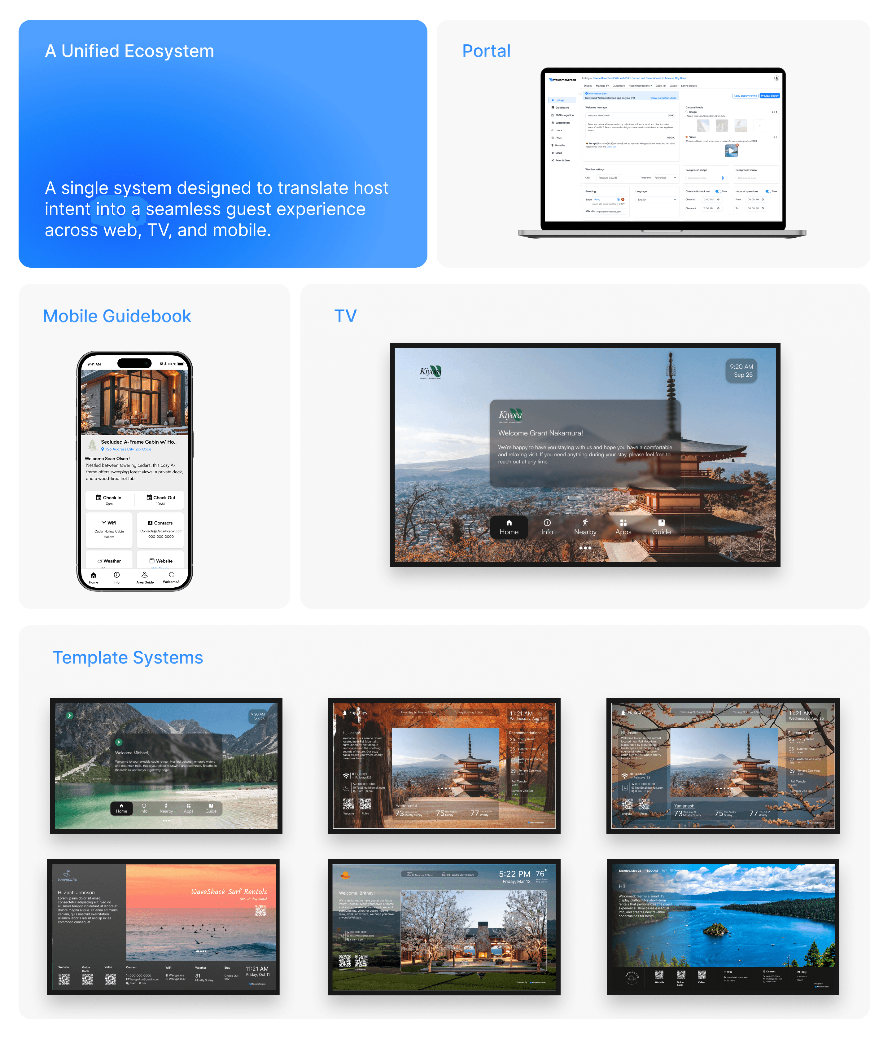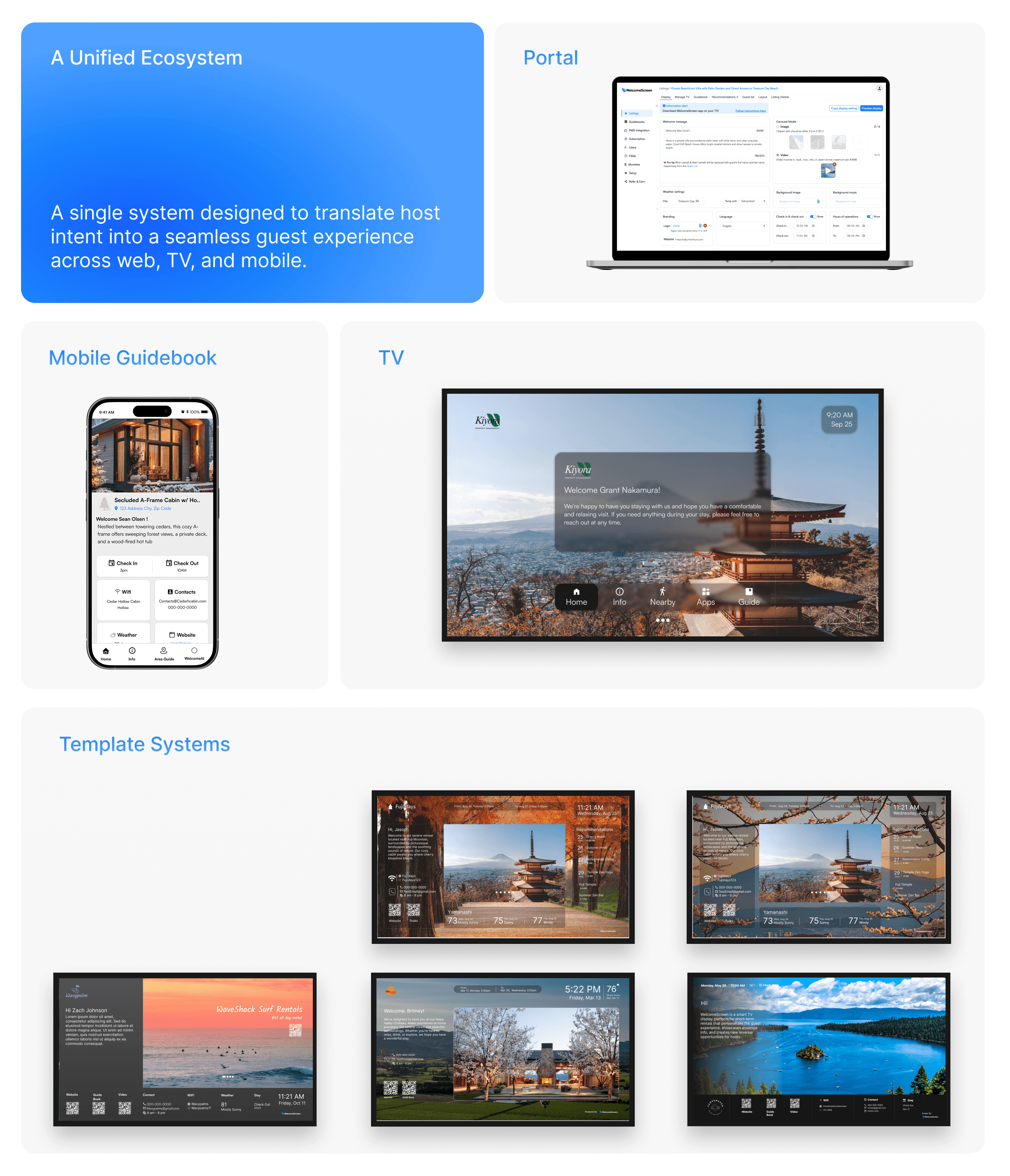TV experience (guest-facing), mobile guidebook, and host management portal, connected through a shared data and layout system.