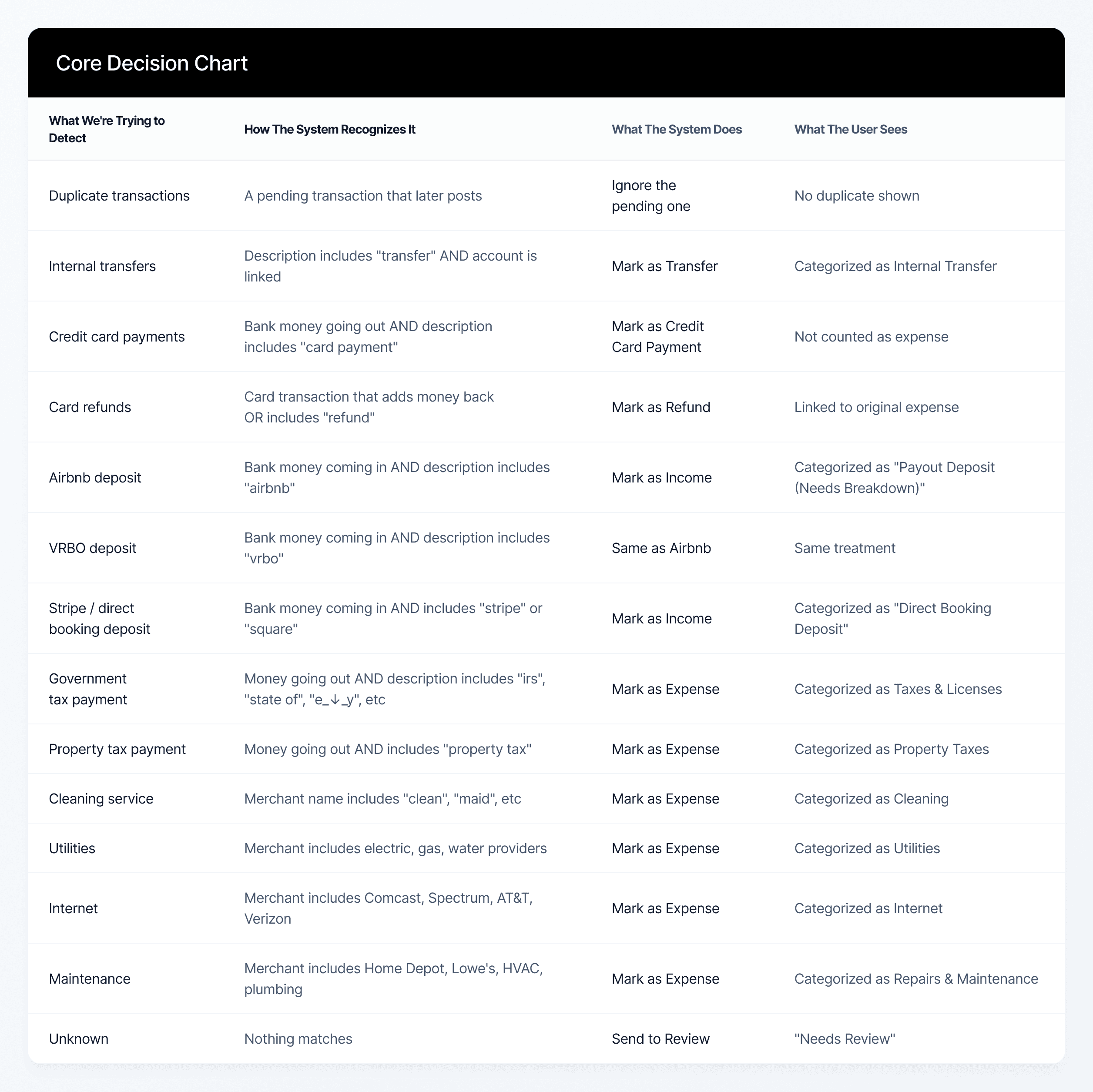 A significant portion of the work focused on mapping real transaction patterns to tax-relevant categories, defining attribution rules across properties, and modeling how accountants validated records.