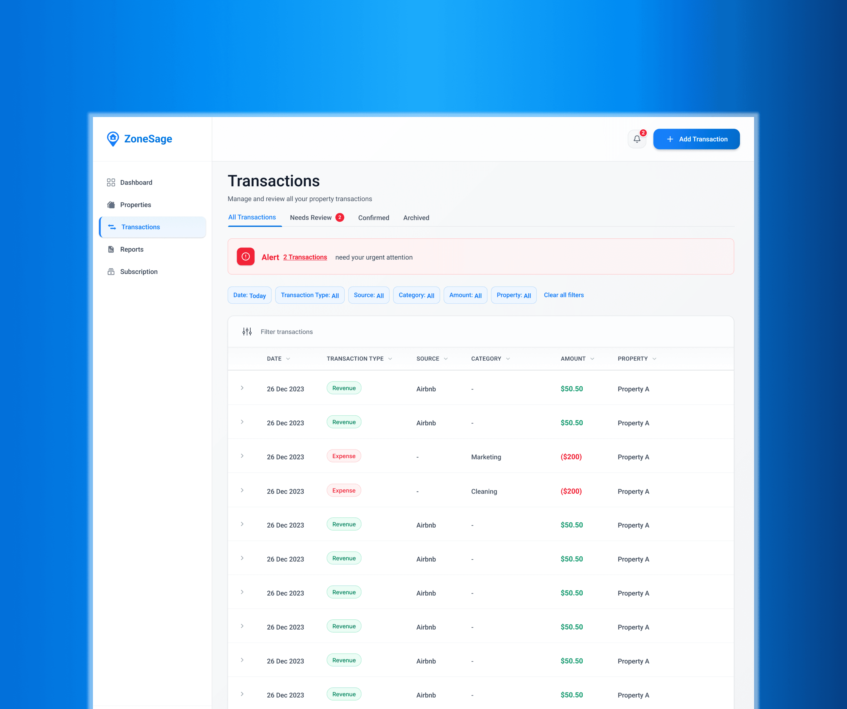 ZoneSage was a financial operations platform for short-term rental operators, built to track transactions, categorize expenses, and generate tax-ready reports. The structural opportunity was real: tax advantages in short-term rentals only materialize when transactions are recorded with precision. Most operators were leaving money on the table.